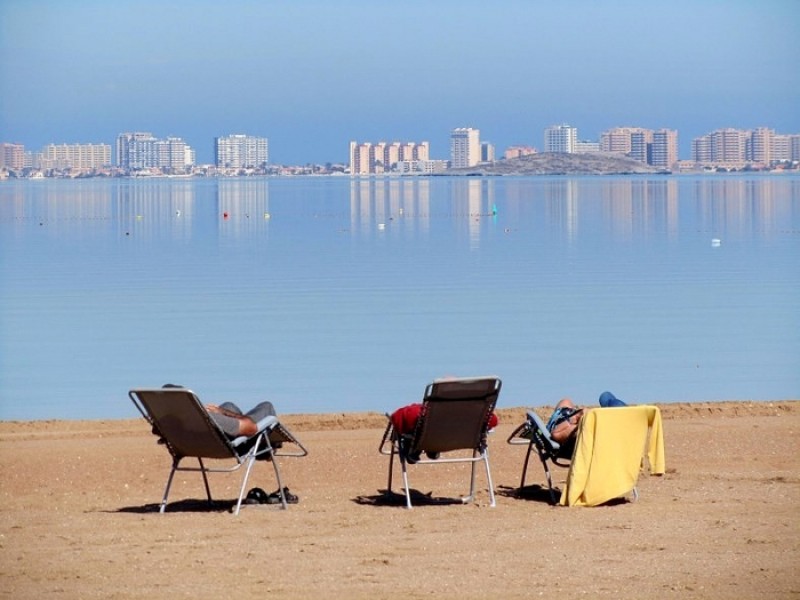 Playa Mar de Cristal, fine sand and spectacular views across the Mar Menor to La Manga.